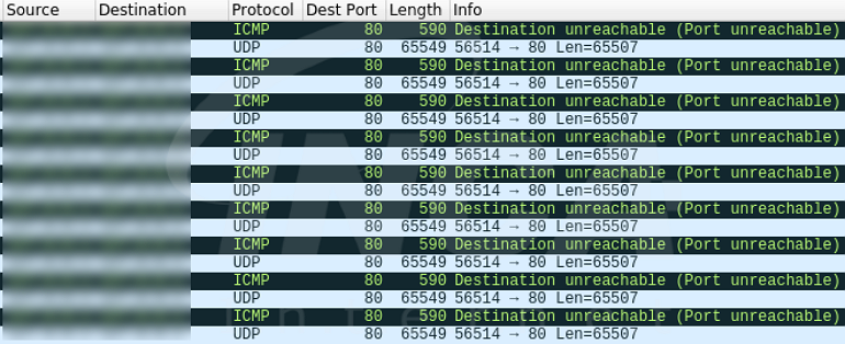 아래 [그림 17]는 공격 대상의 IP와 포트 번호를 임의로 조작하여 “EnemyBot” 의 DDoS 공격 중 하나인 UDP Flooding Attack 을 테스트 한 결과이며, 대량의 패킷이 전송되는 것이 확인된다.