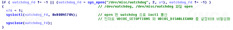 IoT 와 리눅스 서버 등의 장비에서는 의도하지 않은 오작동을 탐지하고 복구하기 위해 Watchdog 이 사용된다. Watchdog 은 문제 해결을 위해 재부팅을 시도하기 때문에 “EnemyBot” 은 Watchdog 을 비활성화하여 재부팅을 방지한다.