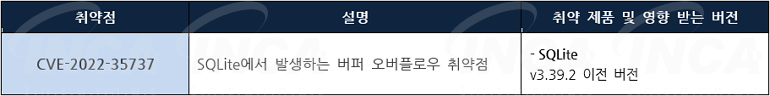 SQLite 사는 제품에서 발생하는 취약점에 대한 보안 업데이트를 발표하고, 관련 취약점을 해결하기 위해 최신 버전으로 업데이트할 것을 권고하였다.