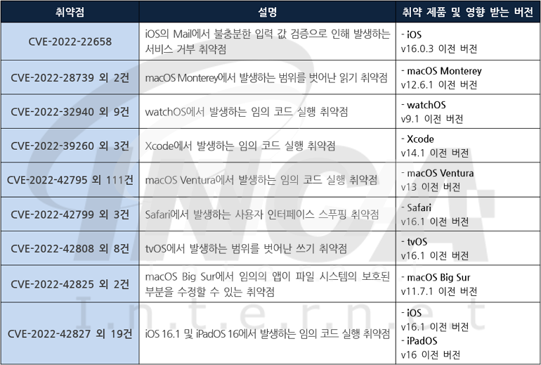 Apple 사는 자사 제품에서 발생하는 취약점에 대한 보안 업데이트를 발표하고, 관련 취약점을 해결하기 위해 최신 버전으로 업데이트할 것을 권고하였다.