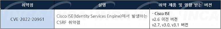 Cisco 사는 제품에서 발생하는 취약점에 대한 보안 업데이트를 발표하고, 관련 취약점을 해결하기 위해 최신 버전으로 업데이트할 것을 권고하였다.