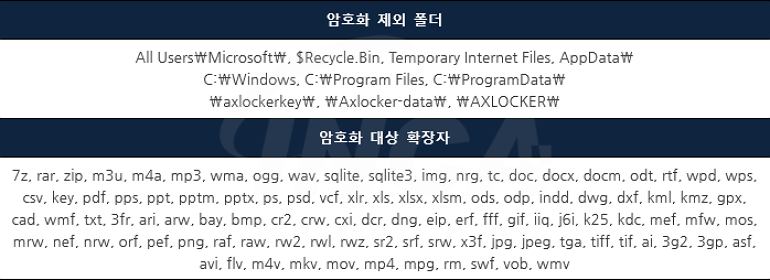 암호화 진행 대상은 [표 1]의 암호화 제외 폴더를 제외한 경로에서 암호화 대상 확장자를 지닌 파일이다.