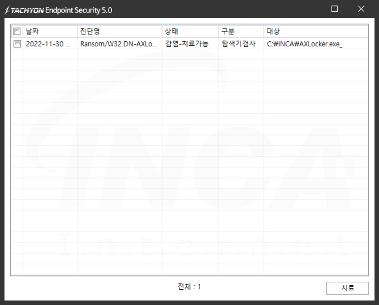 상기 악성코드는 잉카인터넷 안티바이러스 제품 TACHYON Internet Security 5.0에서 진단 및 치료가 가능하다.