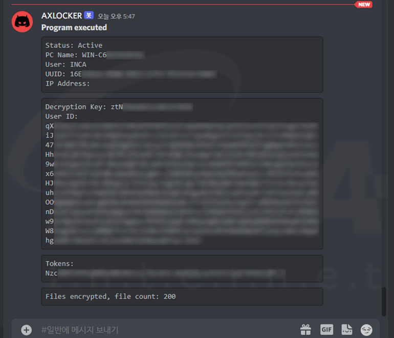 다음으로, 디스코드에서 제공하는 웹훅 기능을 악용해 사용자 PC에서 수집한 정보를 공격자가 운영하는 디스코드 채팅 방으로 전송한다. 현재, 해당 랜섬웨어에 설정된 웹훅 URL은 연결되지 않으며, [그림 3]은 테스트를 위해 직접 디스코드 계정을 생성한 뒤 “AXLocker” 랜섬웨어에서 수집한 정보를 받은 화면이다.