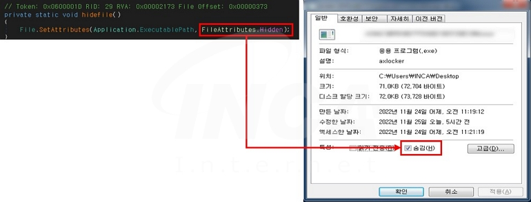 또한, 사용자에게 파일이 보이지 않도록 [그림 2]와 같이 파일의 속성을 숨김으로 변경한다.