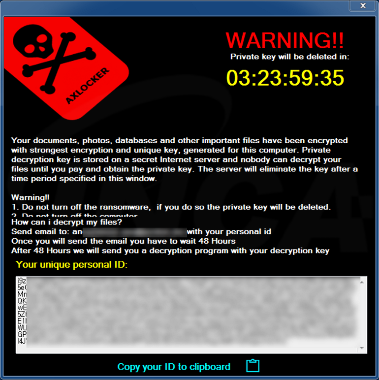 “AXLocker” 랜섬웨어를 실행하면 사용자 PC의 파일을 암호화하며, 암호화가 완료된 파일은 파일 명에 확장자를 추가하지 않고 원본 파일 명을 그대로 사용한다. 암호화 과정이 완료되면 [그림 1]의 랜섬노트를 띄운다.