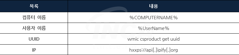 해당 랜섬웨어는 [그림 3]과 같이 정보를 전송하기 전 먼저, 사용자 PC에 설정된 환경 변수 값을 읽어 컴퓨터 이름과 사용자 이름을 수집한다. 그 다음 WMIC의 csproduct 명령을 사용해 UUID 값을 획득하고, 사용자 PC의 IP 정보를 수집한다.