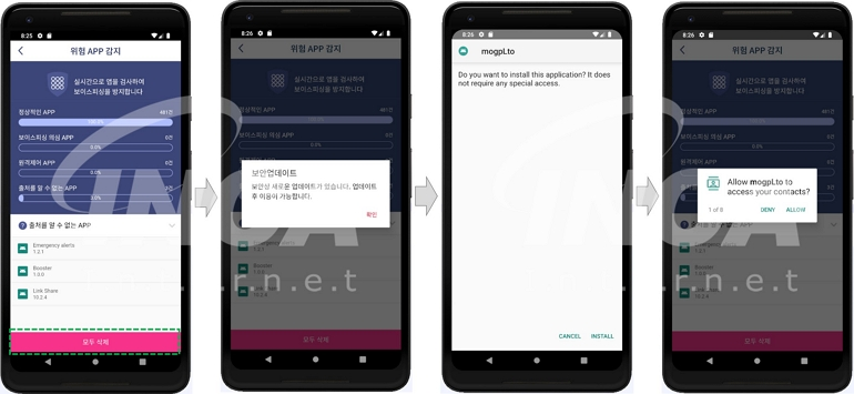 최근 한 보안프로그램을 위장한 악성 앱이 발견되었다. 해당 앱은 정상적으로 동작하는 척하지만, 특정 버튼을 누르면 내부에 존재하는 파일을 실행하여 악의적인 동작을 수행한다. 백도어와 같이 원격지와 연결하여 명령을 받아 추가적인 동작을 수행하며, 그 외에 문자메시지와 통화 기록과 같은 각종 정보를 탈취한다.