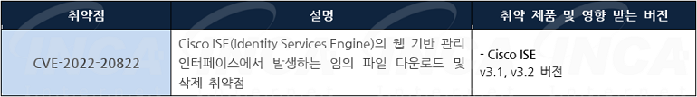 Cisco 사는 제품에서 발생하는 취약점에 대한 보안 업데이트를 발표하고, 관련 취약점을 해결하기 위해 최신 버전으로 업데이트할 것을 권고하였다.