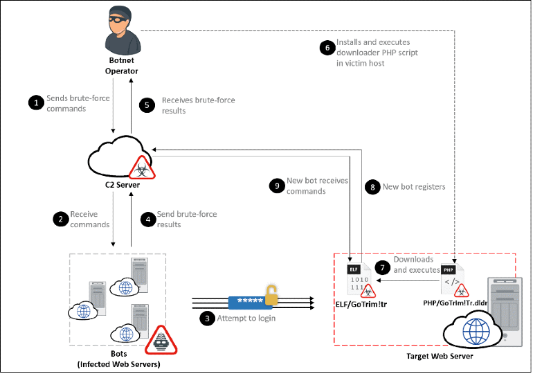 보안 업체 Fortinet에 따르면 이 악성코드는 Go 언어로 개발됐으며, 악성 PHP 스크립트를 통해 유포된다고 알려졌다. 해당 악성코드는 WordPress 웹 서버를 대상으로 무차별 대입 공격을 시도해 대상 서버의 관리자 계정 정보를 탈취한다.