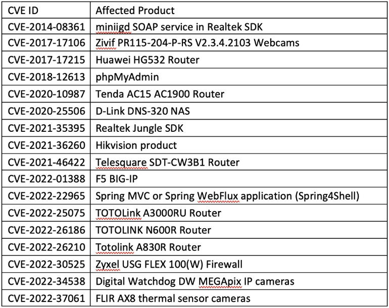 보안 업체 Fortinet에 따르면, 이 악성코드는 Go언어로 작성된 봇넷으로, IoT 장치 및 기타 애플리케이션에서 24개의 보안 취약점을 악용해 전파되는 것으로 알려졌다. 해당 악성코드는 네트워크 스캔 및 자체 전파 기능을 포함하고 있으며, 공격에 성공할 경우 감염된 장치를 봇넷에 추가해 DDoS 공격에 사용한다.