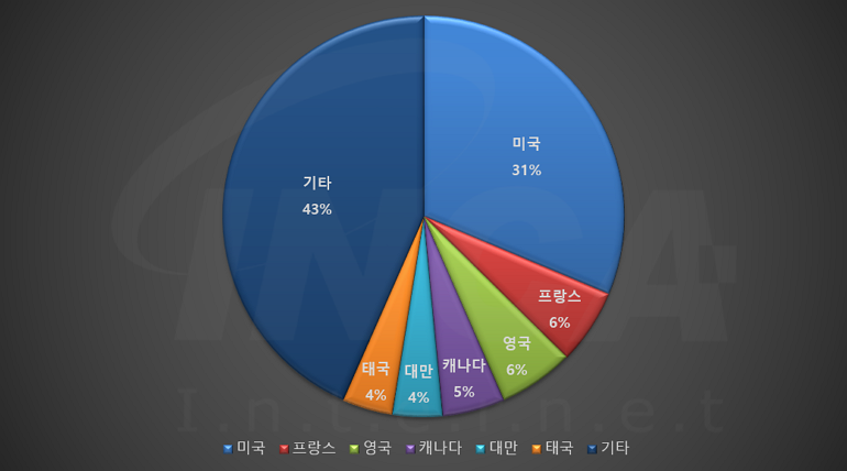 2022년 12월(12월 1일 ~ 12월 31일)에 발생한 데이터 유출 건을 국가별로 비교하였을 때 미국이 31%로 가장 높은 비중을 차지했고, 프랑스와 영국이 6%, 캐나다가 5%로 그 뒤를 따랐다.
