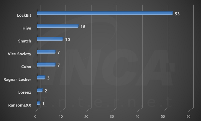 2022년 12월(12월 1일 ~ 12월 31일)에 발생한 데이터 유출 현황을 랜섬웨어 진단명 별로 비교하였을 때 “LockBit” 랜섬웨어가 53건으로 가장 많은 데이터 유출이 있었고, “Hive” 랜섬웨어가 16건으로 두번째로 많이 발생했다.