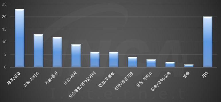 2022년 12월(12월 1일 ~ 12월 31일)에 발생한 데이터 유출 건을 산업별로 비교하였을 때 제조/공급 분야가 가장 많은 공격을 받았고, 교육 서비스 및 기술/통신 분야가 그 뒤를 따랐다.