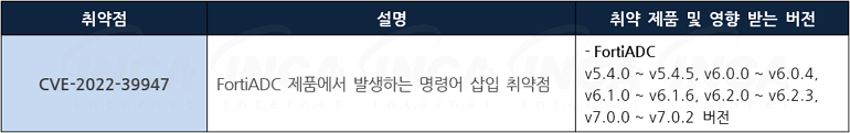 Fortinet 사는 제품에서 발생하는 취약점에 대한 보안 업데이트를 발표하고, 관련 취약점을 해결하기 위해 최신 버전으로 업데이트할 것을 권고하였다.