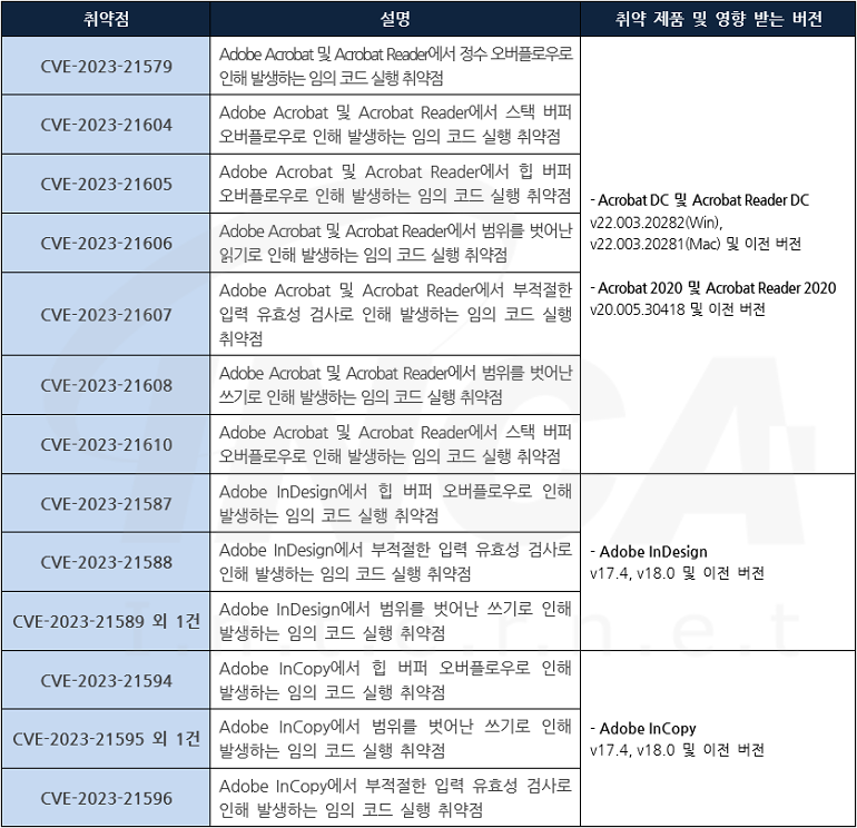 Adobe 사는 제품에서 발생하는 취약점에 대한 보안 업데이트를 발표하고, 관련 취약점을 해결하기 위해 최신 버전으로 업데이트할 것을 권고하였다.