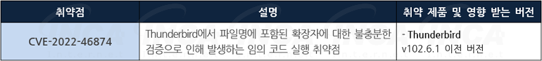Mozilla 재단은 자사 제품에서 발생하는 취약점에 대한 보안 업데이트를 발표하고, 관련 취약점을 해결하기 위해 최신 버전으로 업데이트할 것을 권고하였다.