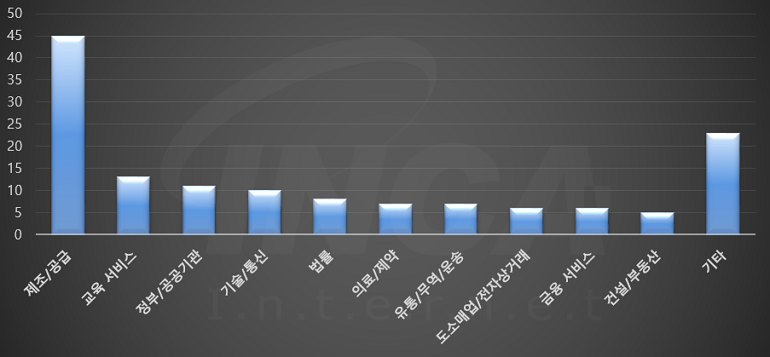 2023년 1월(1월 1일 ~ 1월 31일)에 발생한 데이터 유출 건을 산업별로 비교하였을 때 제조/공급 분야가 가장 많은 공격을 받았고, 교육 서비스 및 정부/공공기관 분야가 그 뒤를 따랐다.