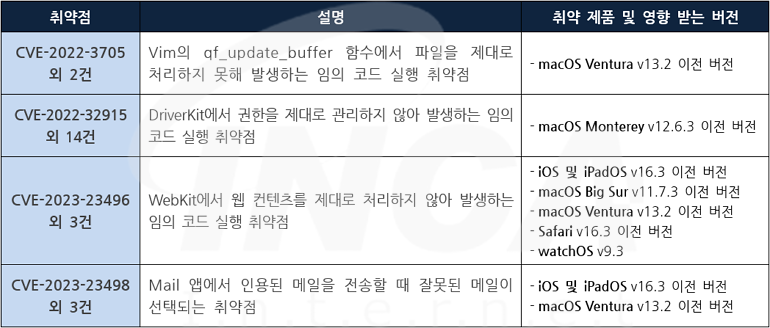 Apple 사는 제품에서 발생하는 취약점에 대한 보안 업데이트를 발표하고, 관련 취약점을 해결하기 위해 최신 버전으로 업데이트할 것을 권고하였다.