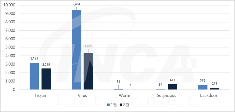 2월에는 악성코드 유형별로 1월과 비교하였을 때 Suspicious의 진단 수가 증가했고 그 외 모든 유형의 진단 수가 전체적으로 감소했다.