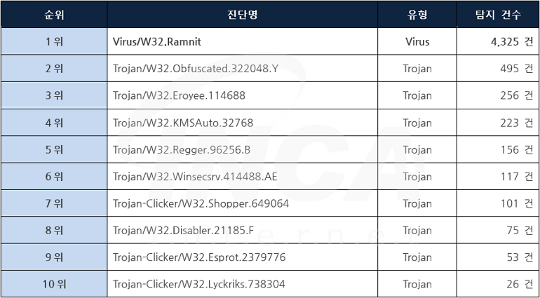 2023년 2월(2월 1일 ~ 2월 28일) 한 달간 잉카인터넷 대응팀은 사용자에게 가장 많이 피해를 준 악성코드 현황을 조사하였으며, [표 1]은 가장 많이 탐지된 악성코드를 탐지 건수 기준으로 정리한 악성코드 Top10이다. 가장 많이 탐지된 악성코드는 Virus(바이러스) 유형이며 총 4,325건이 탐지되었다.