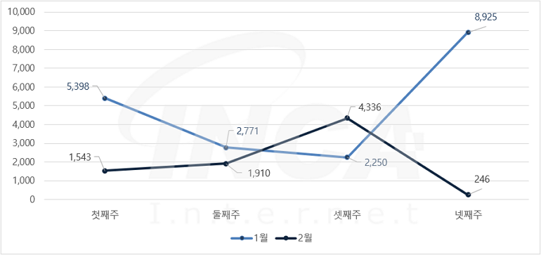 2월 한달 동안 악성코드 진단 현황을 주 단위로 살펴보았을 때 둘째 주까지는 1월에 비해 진단 수가 감소했지만, 셋째 주에는 증가했다가 다시 감소하는 추이를 보이고 있다.