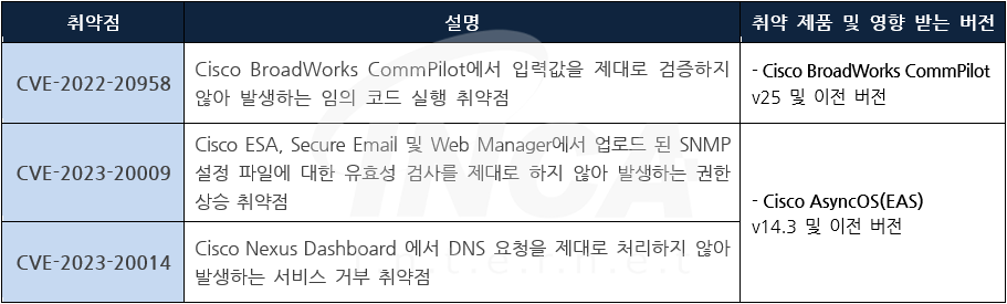 Cisco 사는 제품에서 발생하는 취약점에 대한 보안 업데이트를 발표하고, 관련 취약점을 해결하기 위해 최신 버전으로 업데이트할 것을 권고하였다.