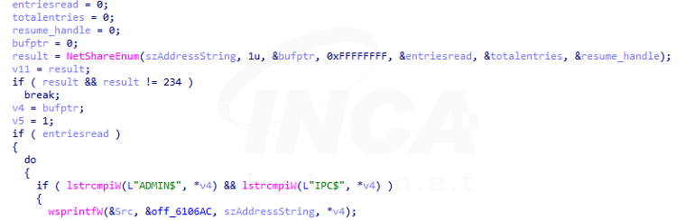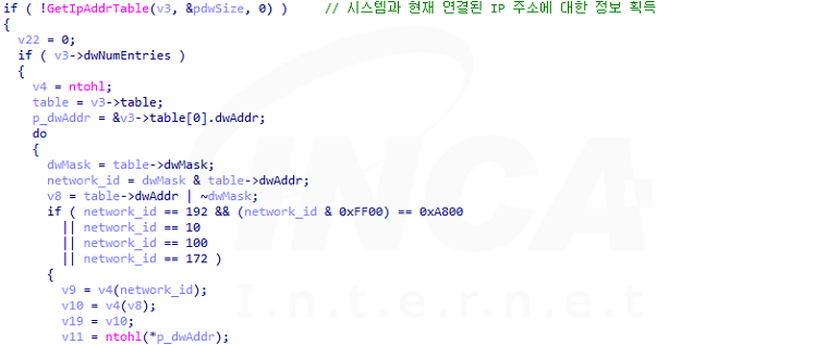 먼저, GetIpAddrTable 함수로 네트워크 인터페이스를 스캔해 감염 대상 환경과 연결된 IP 주소에 대한 정보를 획득하고 이 중, 네트워크 ID가 다음과 같이 시작하는 IP를 검색한다.