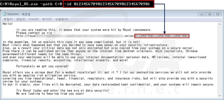 이후, 암호화를 완료한 디렉토리에는 “README.TXT”란 이름의 랜섬노트를 생성하며, 랜섬머니 협상을 위한 사이트 주소와 접속 ID로 사용할 값을 제공한다. 사이트 주소 이후에 전달하는 접속 ID는 Royal 랜섬웨어를 실행할 때 “–id” 인자에 입력한 32 bytes 크기의 문자열이다.