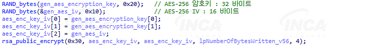이후, 실행파일 내부에 하드코딩된 상태인 공격자의 RSA 공개키를 가져오고, 파일 암호화에 사용한 암호키와 IV를 RSA-4096 암호 알고리즘으로 암호화한다.