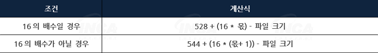 먼저, 파일 크기가 16의 배수인지를 확인하고 [표 5]의 계산식에 따라 패딩 및 공간 할당을 위한 사이즈를 계산한다.