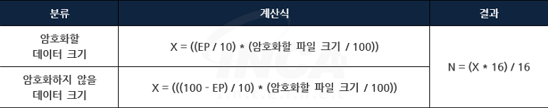 또한, 파일 암호화 과정에서 파일 실행 시 입력하는 “-ep” 인자값 및 파일 사이즈에 따라 파일을 암호화하는 비율을 [표 3]과 같이 적용한다.