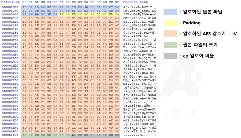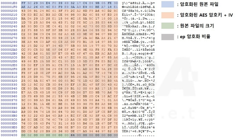 - 암호화된 암호키 + IV 크기 (0x200) / 원본 파일의 크기 (0x8) / -ep 인자 값의 크기 (0x8)