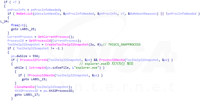 Royal 랜섬웨어는 암호화할 대상 파일에 접근할 수 없는 경우 Windows Restart Manager 를 이용해서 해당 파일과 관련이 있는 프로세스 또는 서비스를 종료한다. 이때, 중요 프로세스가 종료되는 것을 방지하기 위해 "explorer.exe"와 자기 자신은 종료 대상에서 제외한다.