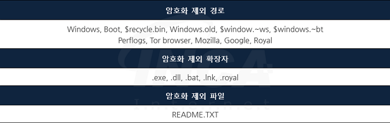 암호화 과정에서 [표 4]에 작성한 경로, 확장자 및 파일은 암호화 대상에서 제외한다.