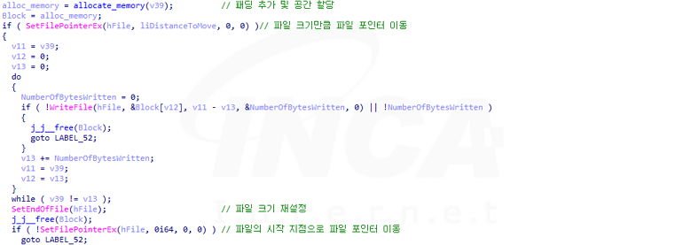 이후, 지정된 크기만큼의 메모리를 할당하며 할당된 주소의 데이터는 초기화하지 않은 채로 사용한다. 마지막으로 파일 크기를 재설정하고 파일 포인터를 파일의 시작 지점으로 이동해 파일 암호화를 준비한다.