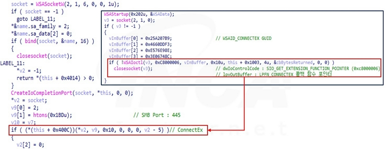 그 다음, 원격 호스트와 연결하기 위한 소켓을 생성하고 SMB 포트로 연결하도록 설정한다. 또한, WSAIoctl 함수로 ConnectEx 의 포인터를 획득한 후, 해당 함수를 호출해 지정된 IP 주소에 연결을 시도한다.