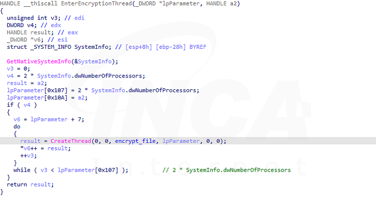 Royal 랜섬웨어는 파일 암호화 속도 향상을 위해 GetNativeSystemInfo 함수를 사용해서 감염 대상 환경의 프로세서 수를 파악하고, 프로세서 수의 두 배만큼의 스레드를 생성한다.