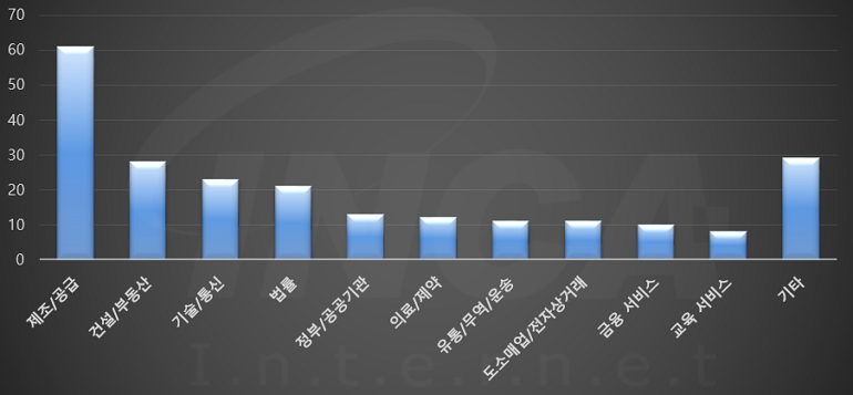 2023년 3월(3월 1일 ~ 3월 31일)에 발생한 데이터 유출 건을 산업별로 비교하였을 때 제조/공급 분야가 가장 많은 공격을 받았고, 건설/부동산 분야가 그 뒤를 따랐다.