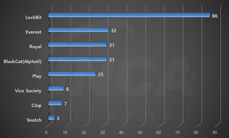 2023년 3월(3월 1일 ~ 3월 31일)에 발생한 데이터 유출 현황을 랜섬웨어 진단명 별로 비교하였을 때 “LockBit” 랜섬웨어가 86건으로 가장 많은 데이터 유출이 있었고, “Everest” 랜섬웨어가 32건으로 두번째로 많이 발생했다.