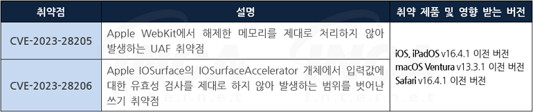Apple 사는 자사 제품에서 발생하는 취약점에 대한 보안 업데이트를 발표하고, 관련 취약점을 해결하기 위해 최신 버전으로 업데이트할 것을 권고하였다.