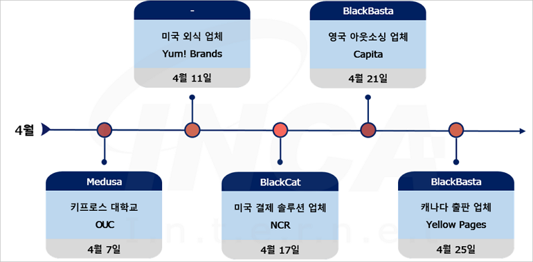 2023년 4월(4월 1일 ~ 4월 30일) 한 달간 랜섬웨어 동향을 조사한 결과, 키프로스 대학교 OUC가 “Medusa” 랜섬웨어 공격을 받은 정황이 발견됐으며, 미국 외식 업체 Yum! Brands가 랜섬웨어 공격을 받아 데이터가 유출된 사건이 있었다. 또한, 미국 결제 솔루션 업체 NCR이 “BlackCat” 랜섬웨어의 공격으로 운영에 차질을 빚었고, 영국 아웃소싱 업체 Capita와 캐나다 출판 업체 Yellow Pages가 “BlackBasta” 랜섬웨어 공격을 받았다.