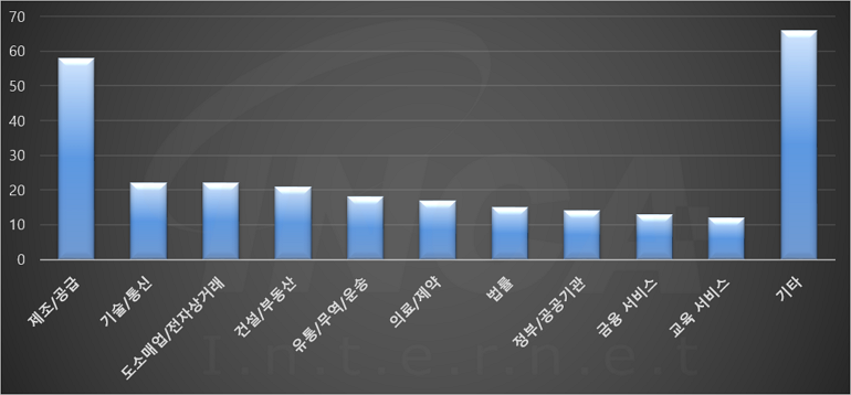2023년 4월(4월 1일 ~ 4월 30일)에 발생한 데이터 유출 건을 산업별로 비교하였을 때 제조/공급 분야가 가장 많은 공격을 받았고, 기술/통신 분야가 그 뒤를 따랐다.