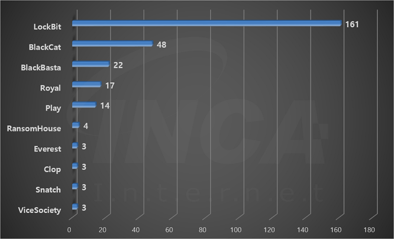 2023년 4월(4월 1일 ~ 4월 30일)에 발생한 데이터 유출 현황을 랜섬웨어 진단명 별로 비교하였을 때 “LockBit” 랜섬웨어가 161건으로 가장 많은 데이터 유출이 있었고, “BlackCat” 랜섬웨어가 48건으로 두번째로 많이 발생했다.