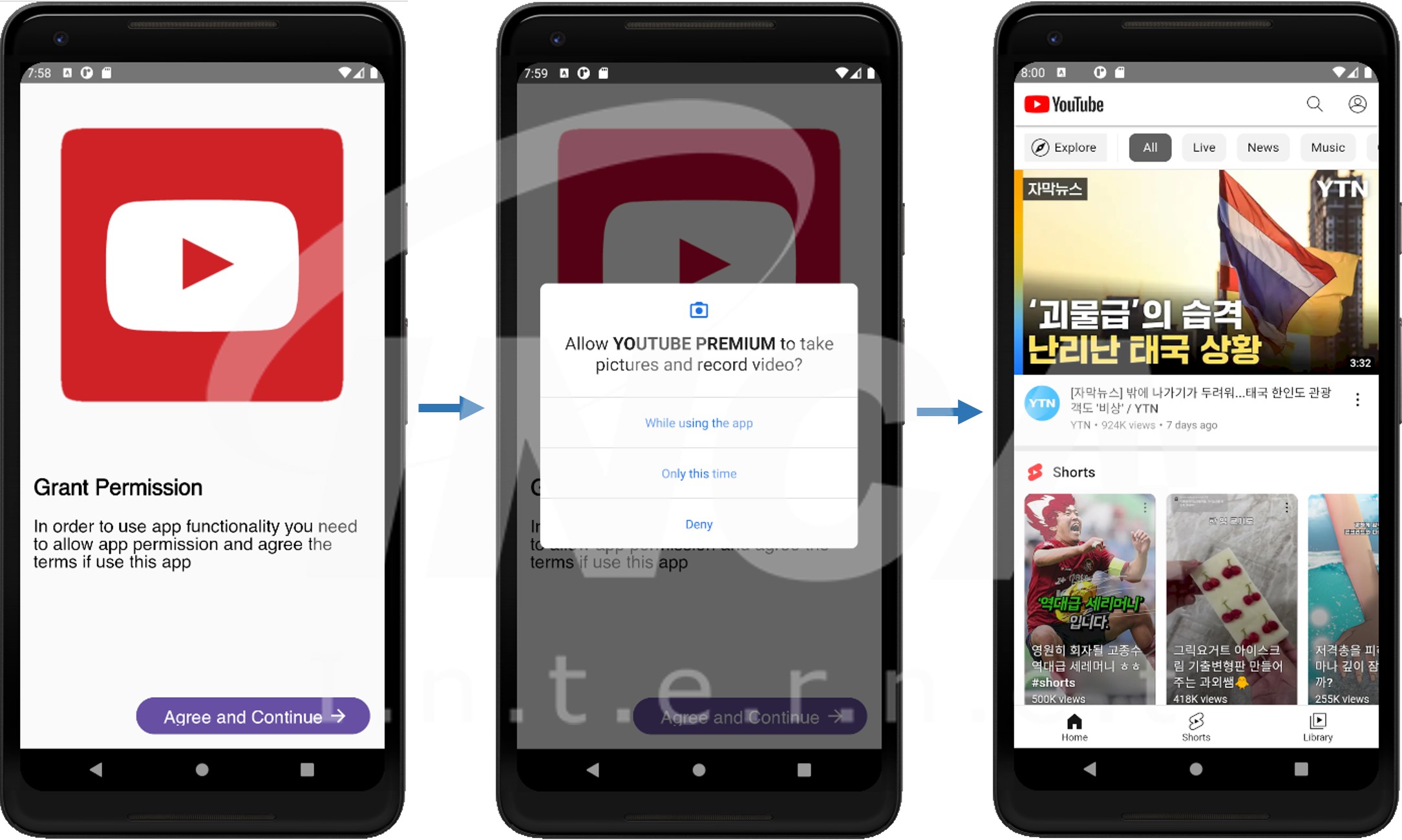 실행화면의 우측 하단 ‘Next’ 버튼을 누르면 각종 권한을 요구한다. 그리고 알림창 접근성 권한까지 획득하고 나면 Youtube 창을 띄워 정상 앱인 척 사용자를 속인다.