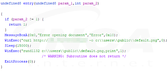 악성 edputil.dll 파일이 로딩되면, 표면상으로는 마치 실행 중 에러가 발생한 것처럼 에러 메시지를 출력한다. 이와 동시에 백그라운드 상에서는 공격자 서버로부터 default.png 라는 이름의 추가 악성 DLL 을 다운로드하며, 다운로드된 파일은 rundll32.exe 에 의해 로딩되어 실행된다.