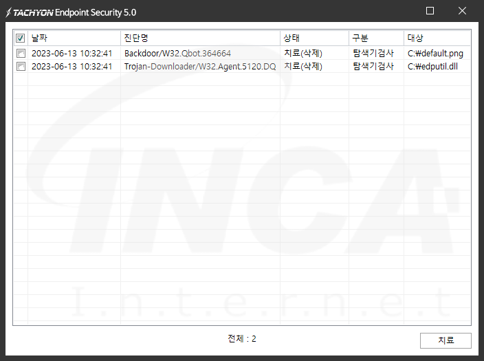 상기 악성코드는 잉카인터넷 안티바이러스 제품 TACHYON Internet Security 5.0에서 진단 및 치료가 가능하다.