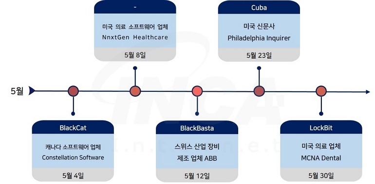 2023년 5월(5월 1일 ~ 5월 31일) 한 달간 랜섬웨어 동향을 조사한 결과, 캐나다 소프트웨어 업체 Constellation Software와 미국 의료 업체 MCNA Dental이 각각 “BlackCat”과 “LockBit” 랜섬웨어 공격을 받아 데이터가 유출된 정황이 공개됐다. 또한, 스위스 산업 장비 제조 업체 ABB가 "BlackBasta" 랜섬웨어 공격을 받아 운영에 차질을 빚었고, 미국 신문사 Philadelphia Inquirer가 “Cuba” 랜섬웨어 공격을 받아 피해를 입은 사례가 있었다. 한편, 미국 의료 소프트웨어 제공 업체 NnxtGen Healthcare도 랜섬웨어 공격을 받았으나 어느 조직에서 공격한 것인지는 알려지지 않았다.